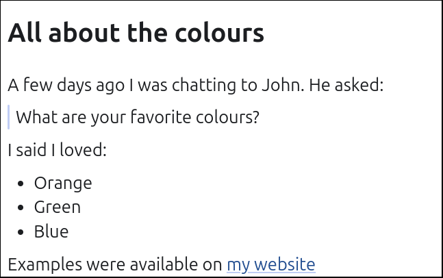 # All about the colours A few days ago I was chatting to John. He asked: > What are your favorite colours? I said I loved: * Orange * Green * Blue Examples were available on [my website](https://example.com)