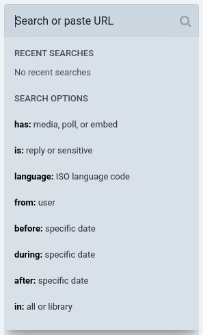 Filter to an individual user. Example: cake from:@bumble@mastodon.social