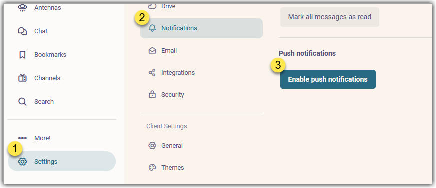 Click Settings 1, Notifications 2, and the “Enable Notifications” 3 button.